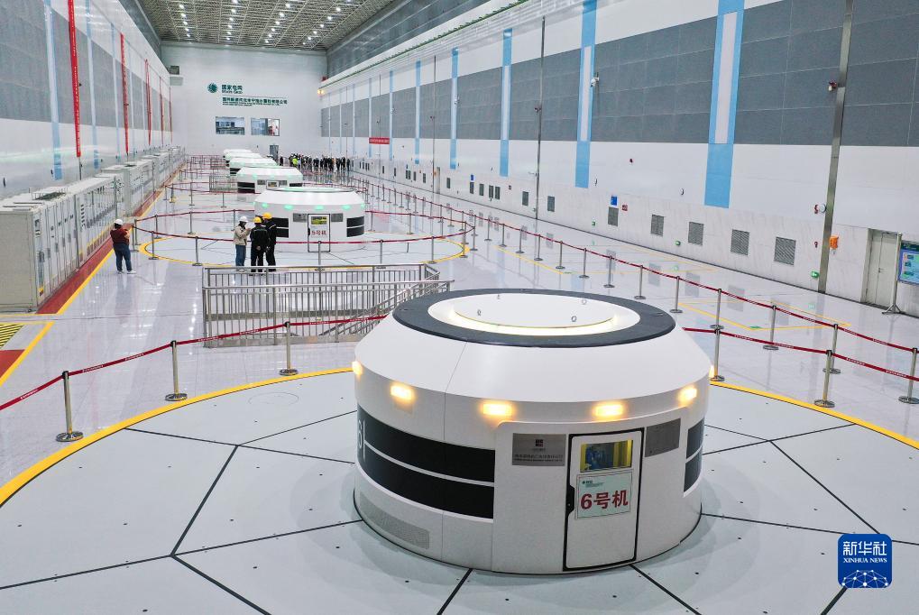 位于河北承德的國網(wǎng)新源豐寧抽水蓄能電站地下廠(chǎng)房?jì)鹊目赡媸剿盟啺l(fā)電機組單機容量30萬(wàn)千瓦(8月19日攝,無(wú)人機照片)。12臺機組全部安裝完成后將是我國自主設計建設、世界裝機容量最大的抽水蓄能電站。