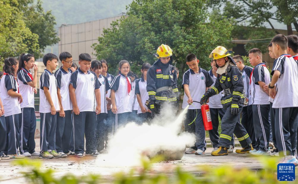 8月21日,消防員在貴州省銅仁市玉屏侗族自治縣黔東民族寄宿制中學(xué)指導學(xué)生使用滅火器滅火。