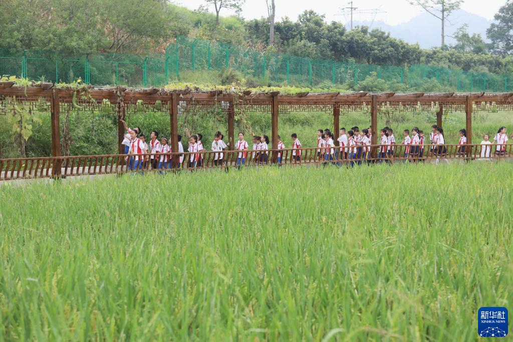 8月21日,學(xué)生在貴州省黔東南苗族侗族自治州施秉縣第四小學(xué)校園勞動(dòng)基地參觀(guān)上學(xué)期栽種的水稻。