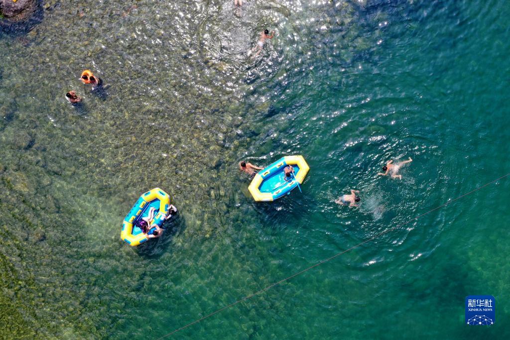 游客在融水苗族自治縣香粉鄉雨卜村戲水消暑(8月19日攝,無(wú)人機照片)。近年來(lái),雨卜村充分利用粵桂協(xié)作幫扶資金,通過(guò)整治河道、修繕古建筑等,發(fā)展鄉村旅游產(chǎn)業(yè),打造鄉村旅游示范村。