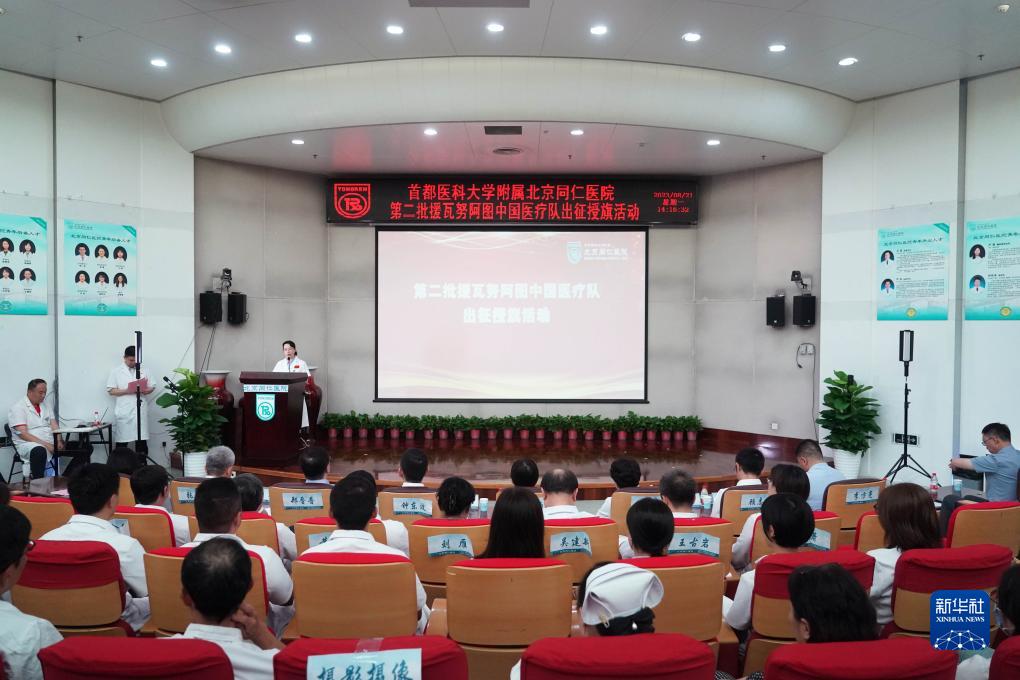 8月21日拍攝的北京同仁醫院第2批援瓦努阿圖中國醫療隊出征授旗活動(dòng)現場(chǎng)。