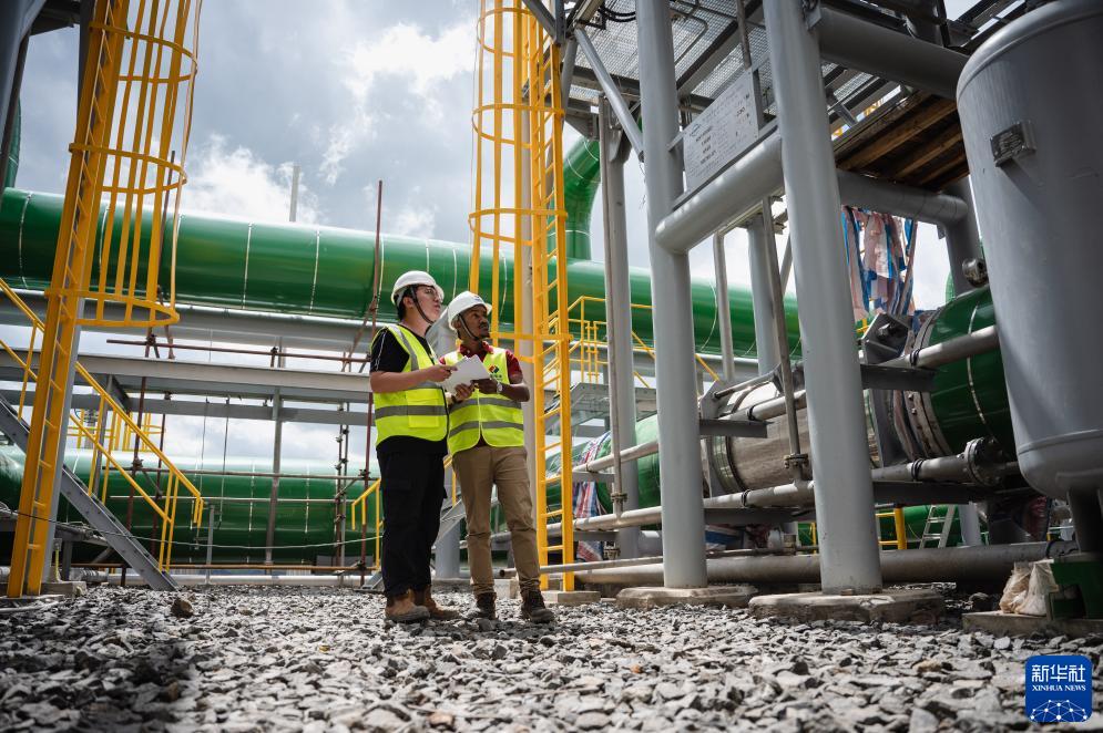5月26日,施工人員在位于肯尼亞納庫魯市的索西安地熱電站項目建設現場(chǎng)檢查發(fā)電設施。