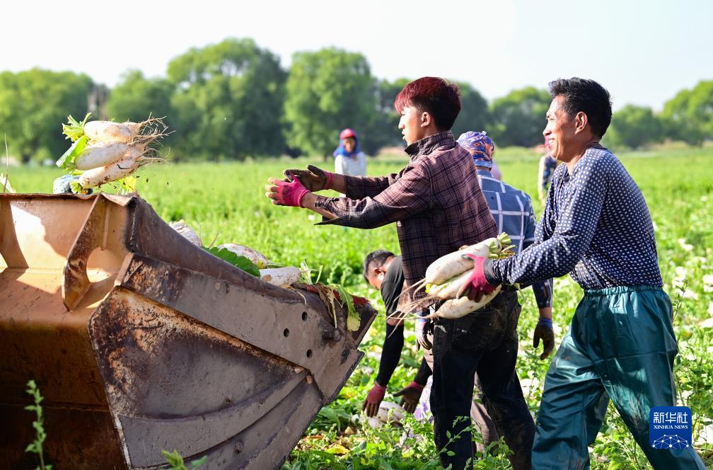 8月21日,農牧民在鄂托克前旗城川鎮白蘿卜種植基地收獲白蘿卜。