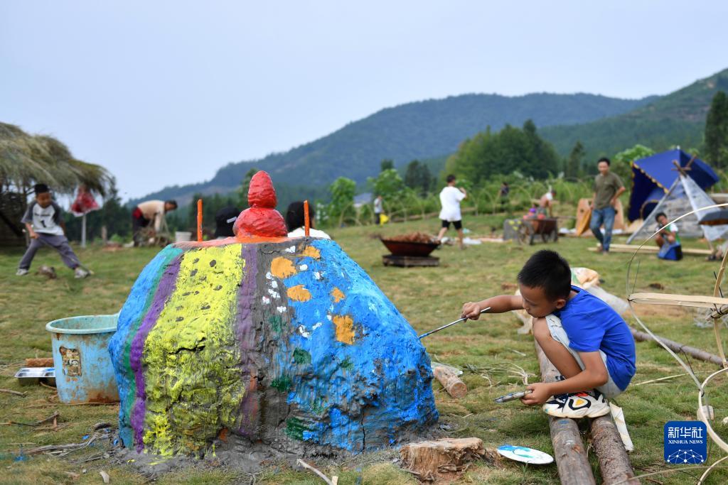 8月19日,小朋友在大元社草坪劇場(chǎng)的陶土裝置上繪畫(huà)。