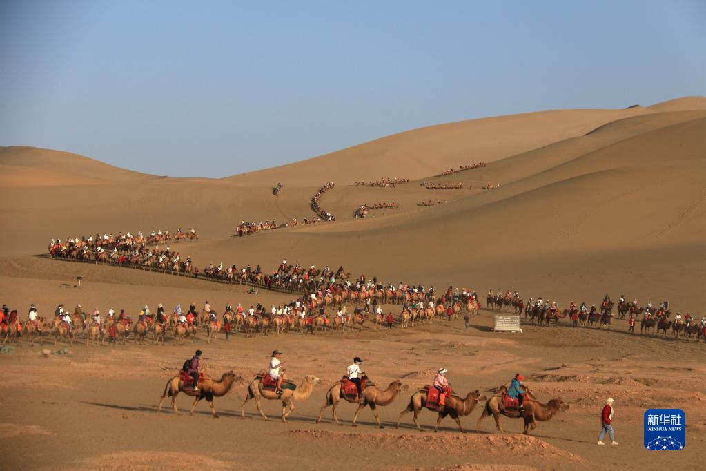 初秋時(shí)節,甘肅省敦煌市碧空如洗,鳴沙山月牙泉景區景色如畫(huà),引人入勝。