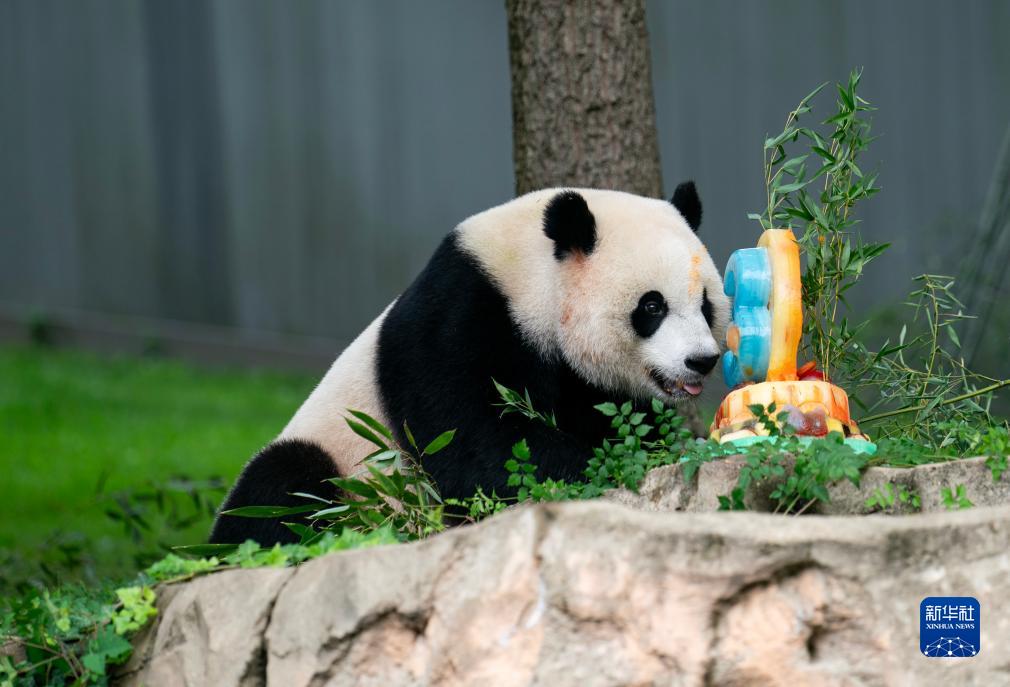 8月21日,大熊貓幼崽“小奇跡”在美國首都華盛頓史密森學(xué)會(huì )國家動(dòng)物園享用生日蛋糕。