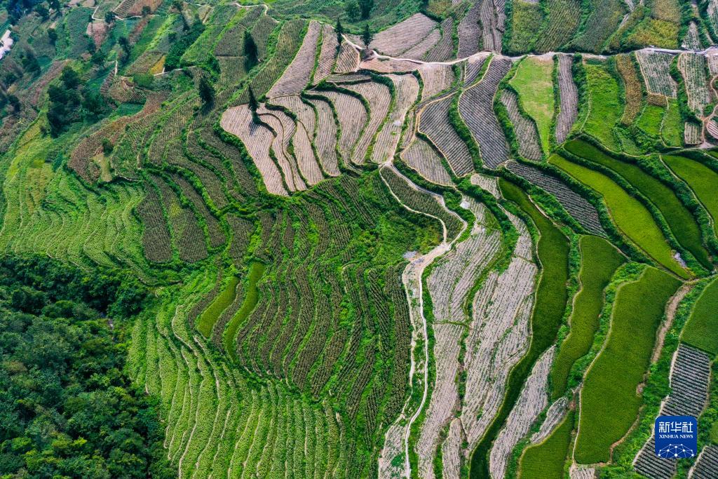 8月19日拍攝的酉陽(yáng)縣丁市鎮中壩村梯田景觀(guān)(無(wú)人機照片)。