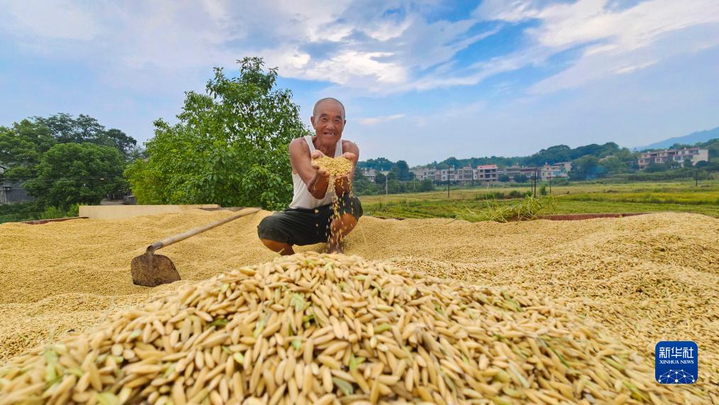 8月20日,湖南省常寧市板橋鎮西洞村農民展示剛收獲的稻谷。
