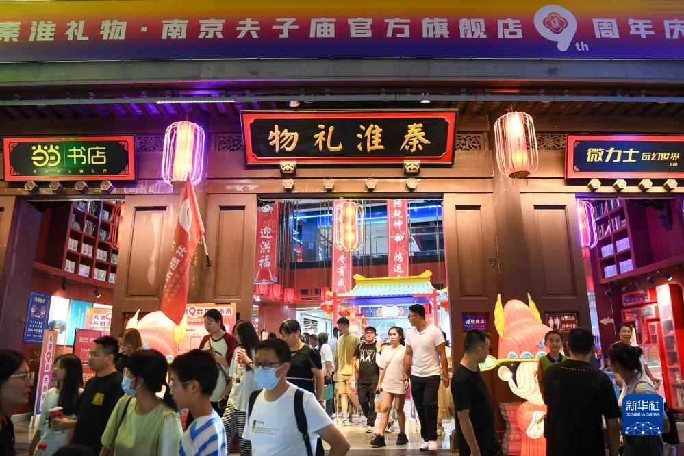 游客來(lái)到南京夫子廟—秦淮風(fēng)光帶秦淮禮物商店選購紀念品(8月18日攝)。