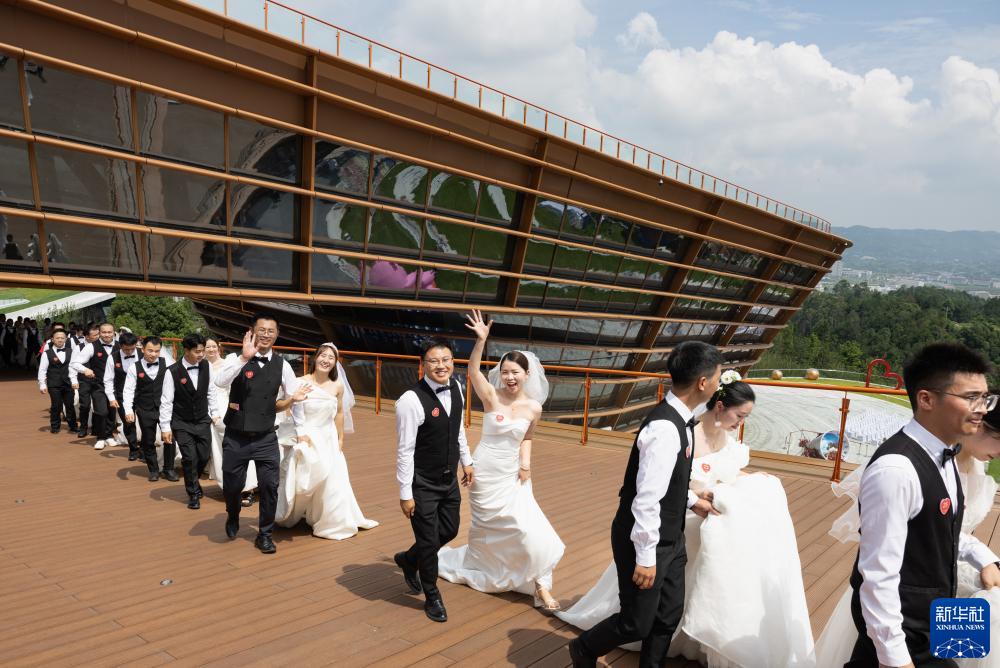 當日是七夕,來(lái)自四川省宜賓市三江新區33對新人在三江新區“三江之眼”舉辦了“為愛(ài)奔赴·幸福三江”主題集體婚禮。