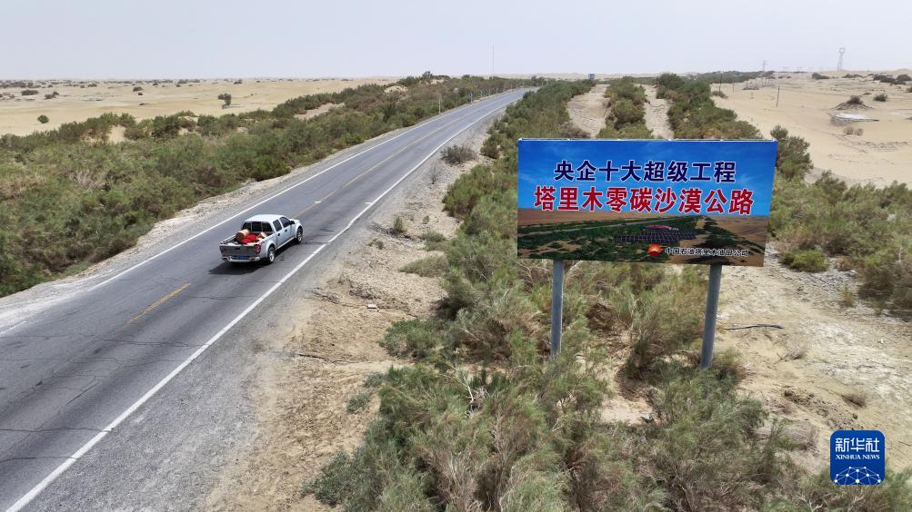 在位于新疆的塔克拉瑪干沙漠腹地,中國首條貫穿塔克拉瑪干沙漠的等級公路——塔里木零碳沙漠公路,像一條綠色長(cháng)龍蜿蜒曲折,在沙漠深處延伸。