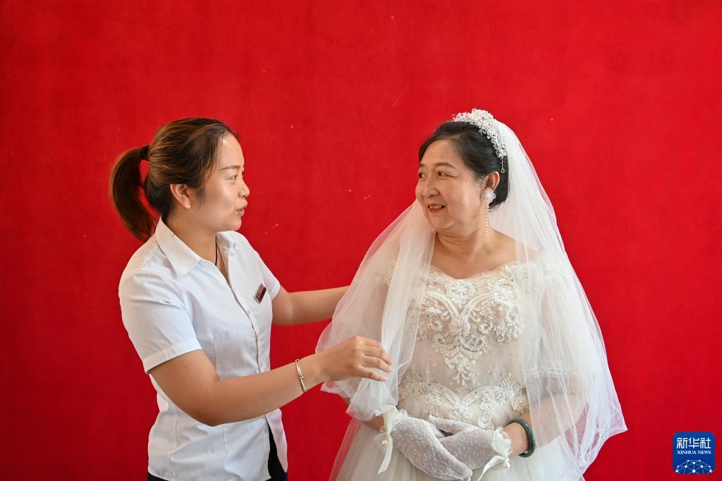 8月22日,工作人員為參與拍攝的居民整理婚紗。