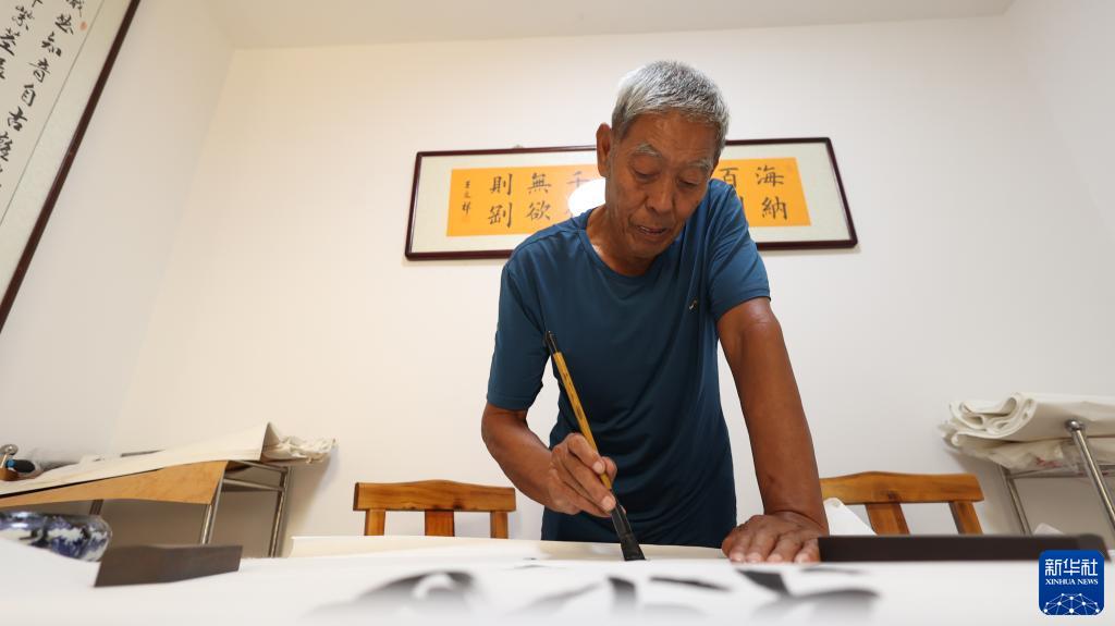 8月22日,老人在青縣曹寺鎮曹寺村的孝老食堂練習書(shū)法。