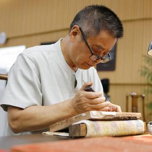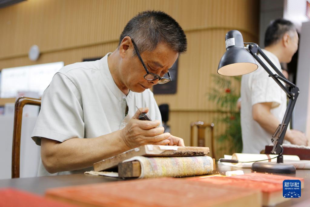 8月22日,在揚州市圖書(shū)館,江蘇省雕版工藝美術(shù)大師沈樹(shù)華在“古籍里的揚州運河文化”市集上為市民展示雕刻技藝。