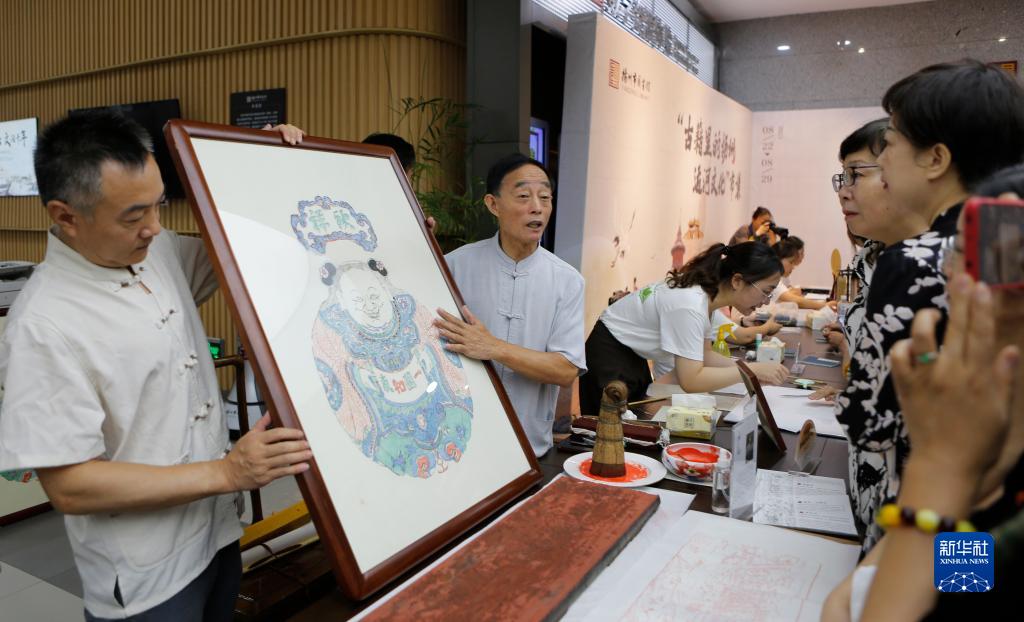 8月22日,在揚州市圖書(shū)館,雕版印刷技藝代表性傳承人李江民在“古籍里的揚州運河文化”市集上為市民展示雕版印刷品。