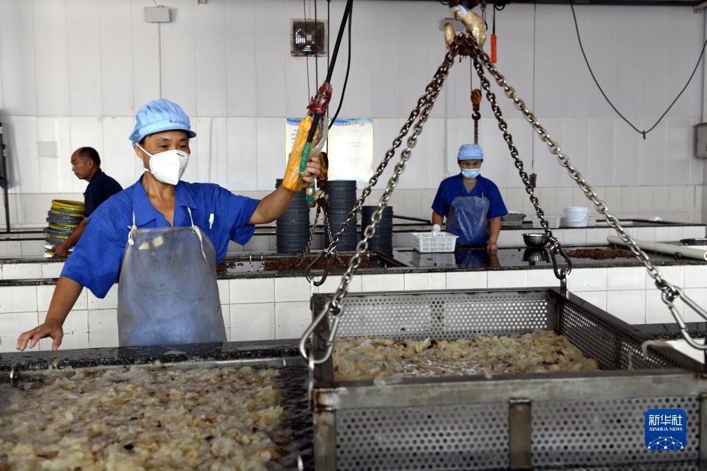 8月22日,在山東省濱州市沾化區馮家鎮隆旺水產(chǎn)的加工車(chē)間內,工人正在給海蜇更換浸泡用水,保證咸度適中。