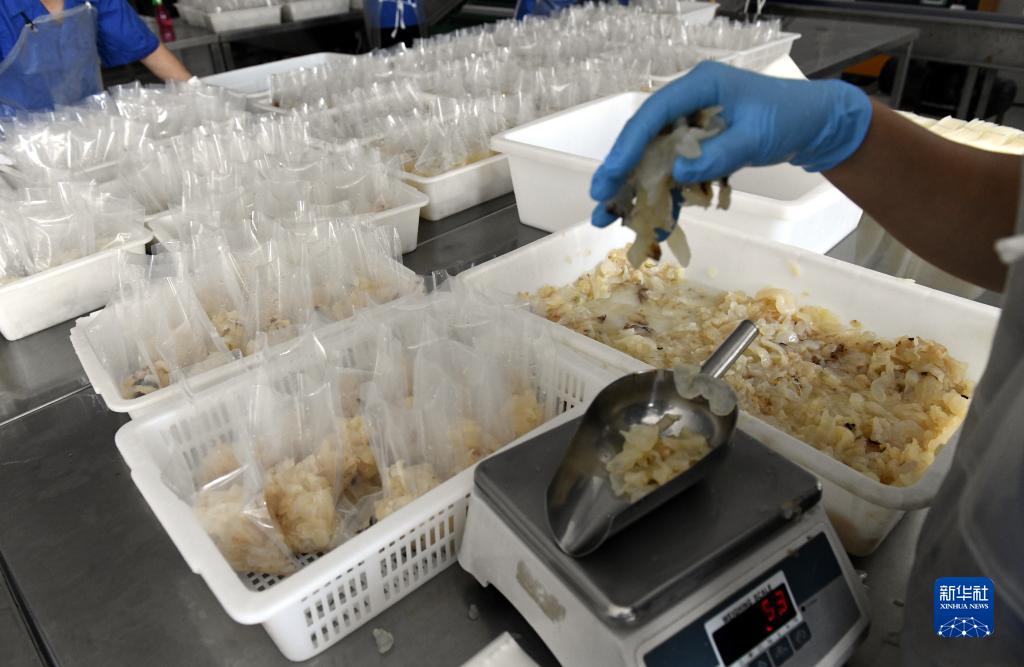 8月22日,在山東省濱州市沾化區馮家鎮隆旺水產(chǎn)的加工車(chē)間內,工人在加工即食海蜇。