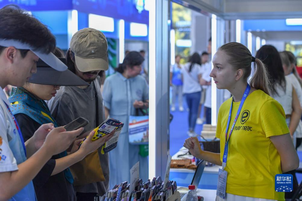 8月23日,在第十四屆中國—東北亞博覽會(huì )東北亞商品館,俄羅斯參展商向參觀(guān)者介紹商品。