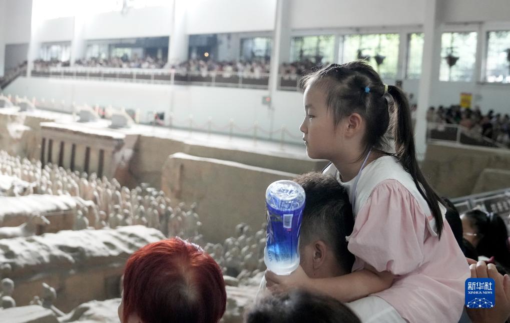 8月23日,一名小游客騎在家人肩上參觀(guān)秦始皇兵馬俑博物館。
