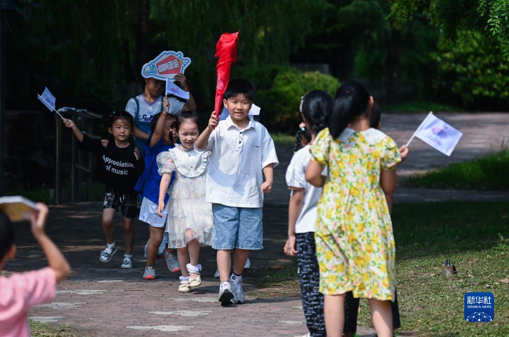8月24日,在湖州市龍泉街道白魚(yú)潭社區,孩子們拿著(zhù)自己制作的火炬,參與趣味火炬傳遞活動(dòng)。