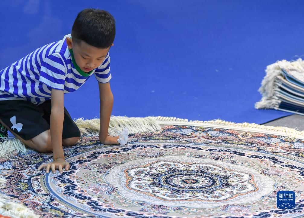 8月23日,在第十四屆中國—東北亞博覽會(huì )國際商品館,一名小朋友近距離體驗伊朗地毯。