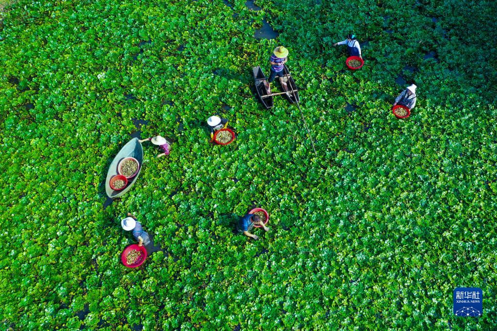 8月24日,河南省信陽(yáng)市光山縣司馬光小鎮升輝合作社農民在采摘菱角(無(wú)人機照片)。