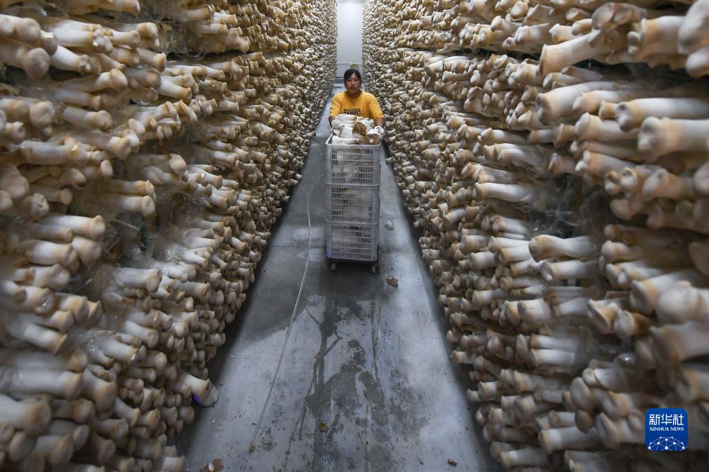 8月24日,在連云港市灌南縣一家食用菌企業(yè),工作人員在生產(chǎn)車(chē)間運輸剛采摘的杏鮑菇。