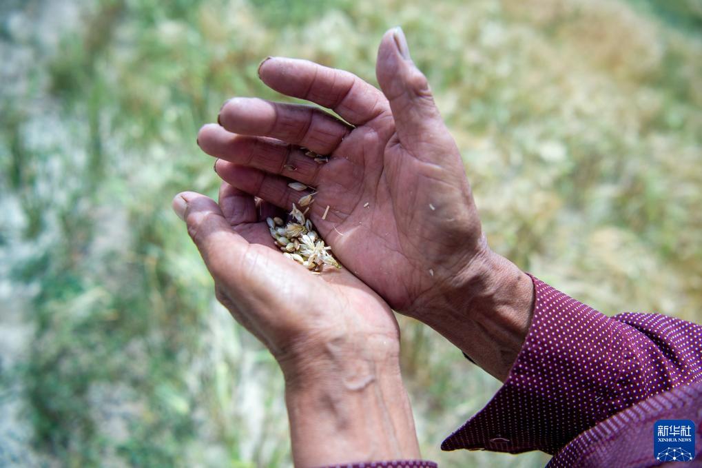久美老人手捧著(zhù)青稞粒(8月24日攝)。