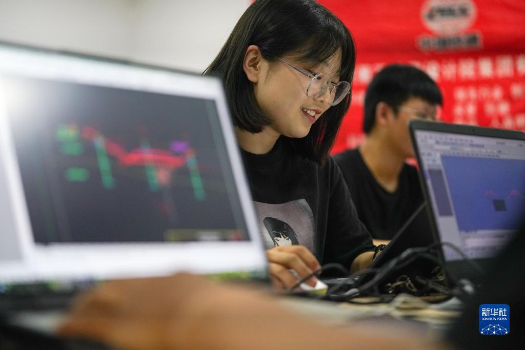 在黑龍江省雙鴨山市集賢縣的佳撫鐵路改造工程總體組辦公區,鐵路設計師王夢(mèng)迪(左)在進(jìn)行設計工作(8月23日攝)。