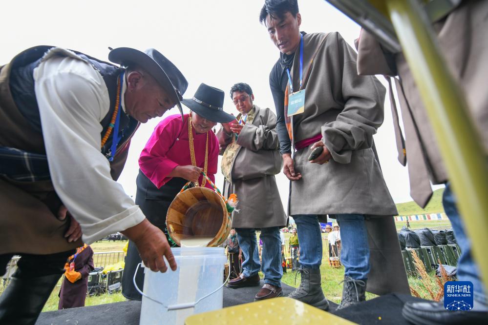 8月25日,在四川省阿壩藏族羌族自治州紅原縣雅克音樂(lè )牧場(chǎng),參賽者在比賽結束后倒出牦牛奶稱(chēng)重。