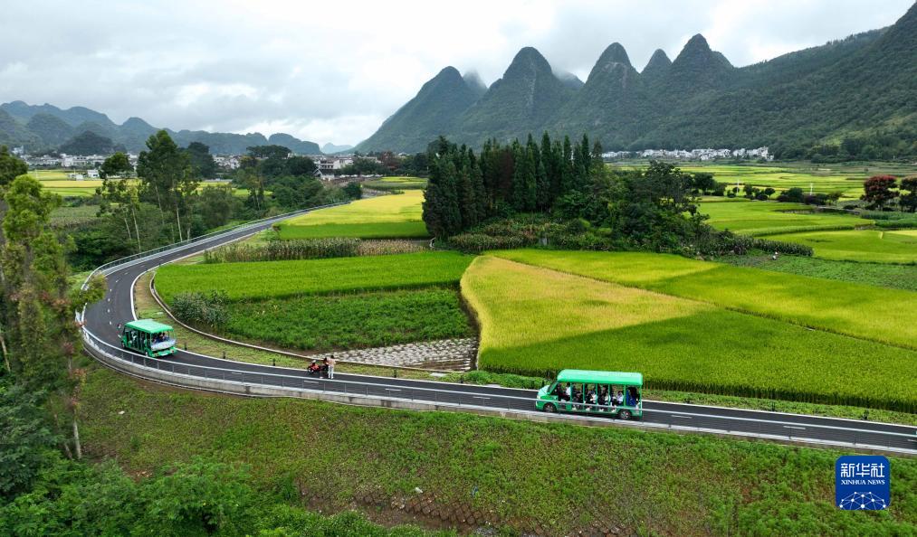 8月25日,游客乘坐觀(guān)光車(chē)在貴州省黔西南布依族苗族自治州興義市萬(wàn)峰林景區觀(guān)光游覽(無(wú)人機照片)。新華社發(fā)(袁福洪攝)