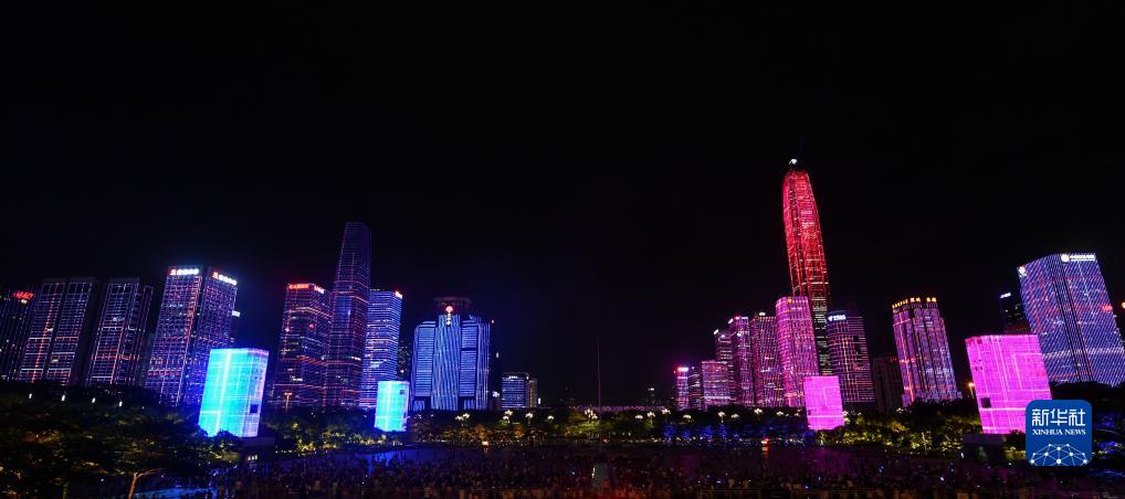 8月26日是深圳經(jīng)濟特區成立43周年。25日晚,深圳以夜空為幕,以燈光為筆,點(diǎn)亮市區主要建筑為特區慶生。新華社記者 梁旭 攝