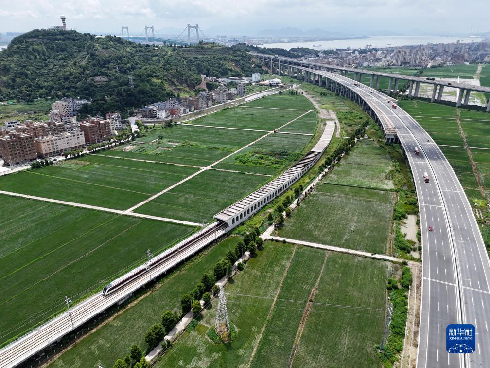 8月26日拍攝的溫州軌道交通S2線(xiàn)列車(chē)(無(wú)人機照片)。
