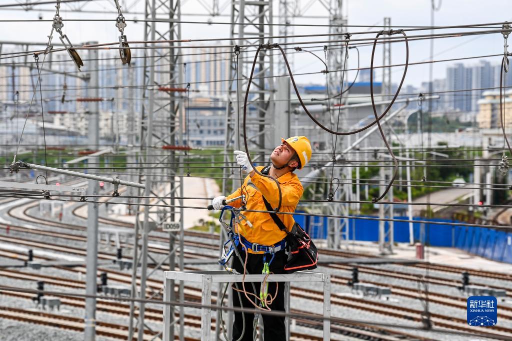 當日,中國鐵路南寧局集團有限公司南寧供電段的接觸網(wǎng)工對南寧第二動(dòng)車(chē)所存車(chē)線(xiàn)內26條股道中達到檢調標準的股道進(jìn)行檢查,為即將全線(xiàn)開(kāi)通的貴南高鐵做準備。