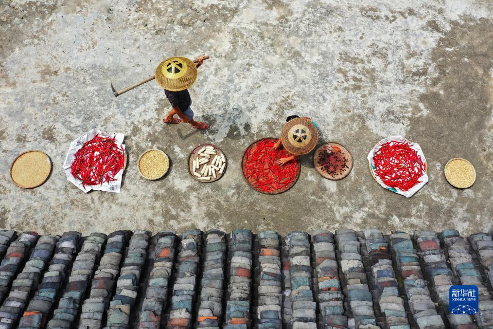 8月27日,湖南省常寧市官嶺鎮馬王塘村農民在房前晾曬辣椒、玉米等(無(wú)人機照片)。