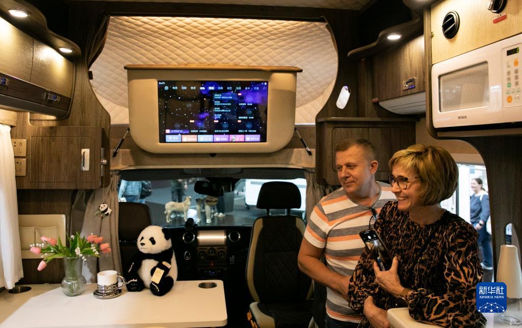 8月28日,人們在德國杜塞爾多夫國際房車(chē)展上參觀(guān)來(lái)自中國的戴德房車(chē)。