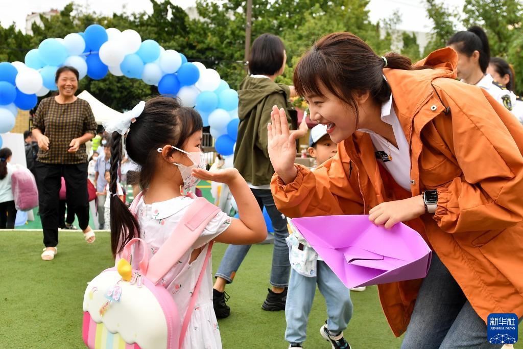 8月28日,在山東省青島市市南區金鑰匙幼兒園新學(xué)期開(kāi)學(xué)迎接儀式上,一名小朋友與老師擊掌致意。