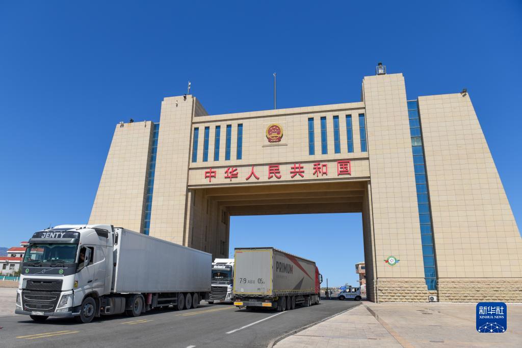 新疆阿拉山口口岸,幾輛貨車(chē)在進(jìn)出國門(mén)(7月24日攝)。2023年上半年,阿拉山口口岸跨境電商累計出口包裹1450.24萬(wàn)票,完成貿易額16.77億元,同比增長(cháng)10.3%。