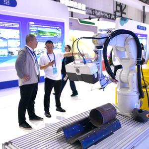 這是在2023綠色低碳高質(zhì)量發(fā)展大會(huì )裝備展上展出的工業(yè)機器人設備(8月29日攝)。