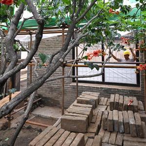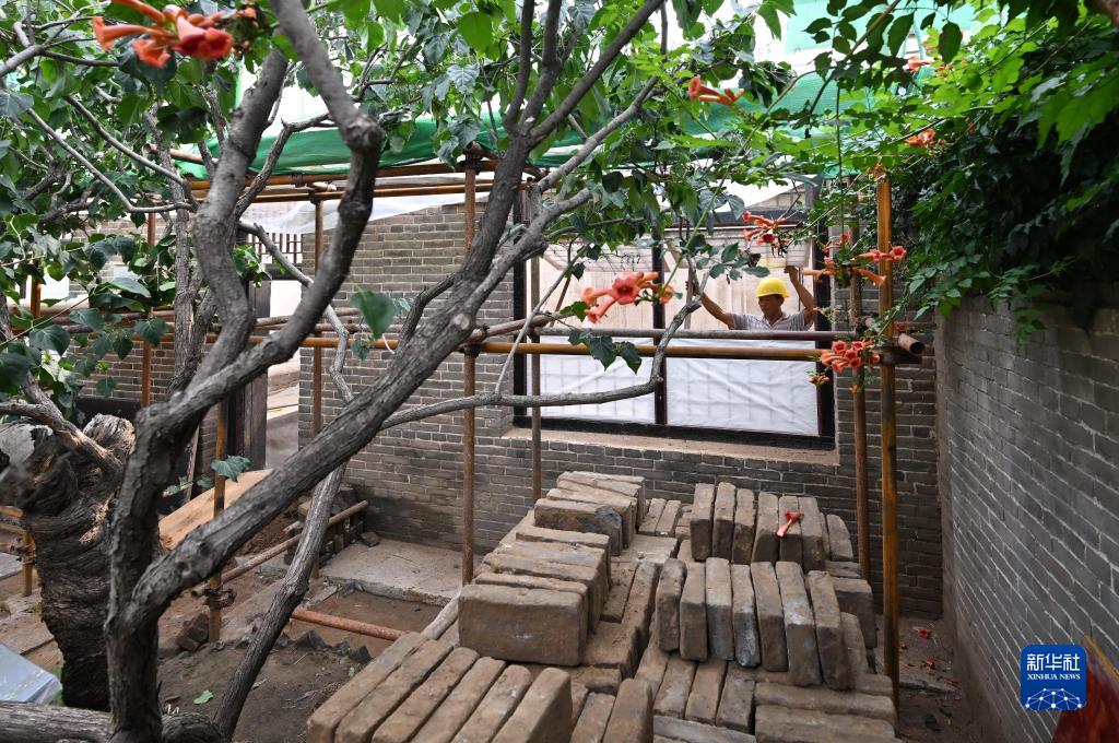 8月29日,工人在李大釗故居維修保護工程工地施工。
