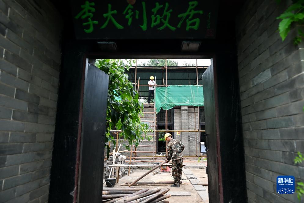 8月29日,工人在李大釗故居維修保護工程工地施工。