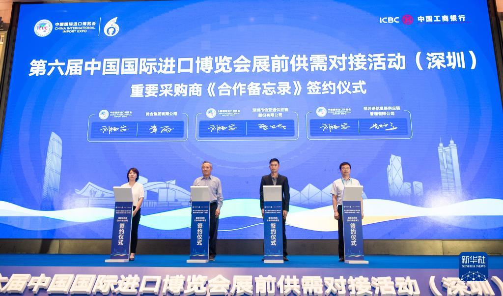 8月29日在第六屆中國國際進(jìn)口博覽會(huì )展前供需對接活動(dòng)(深圳)上拍攝的重要采購商《合作備忘錄》簽約儀式。