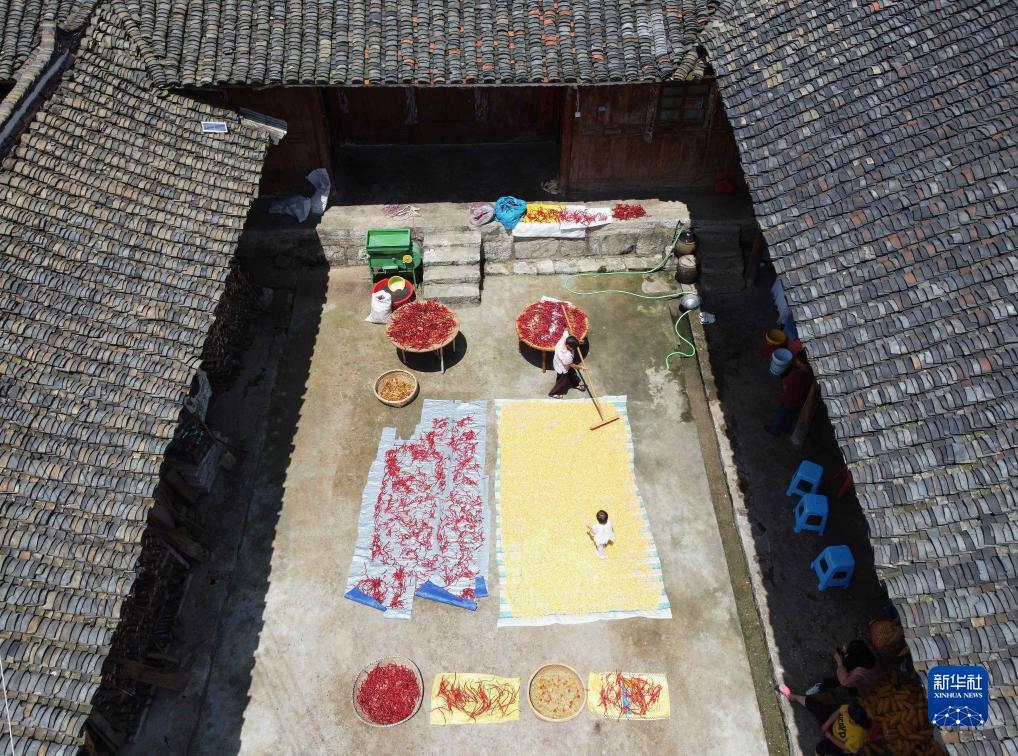 8月29日,貴州省黔東南苗族侗族自治州施秉縣牛大場(chǎng)鎮紫荊村村民在晾曬作物(無(wú)人機照片)。
