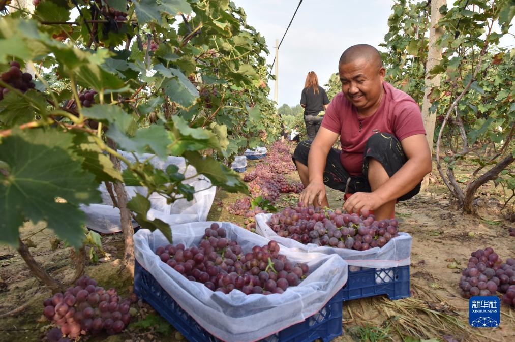 8月30日,邢臺市威縣戚霍寨村一家庭農場(chǎng)果農在采摘葡萄。