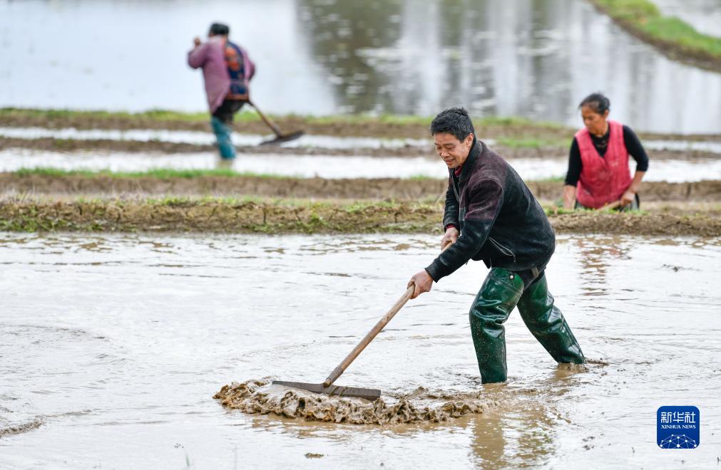 陳良東(前)與村民在水稻制種基地里平整田塊,準備播種(4月6日攝)。
