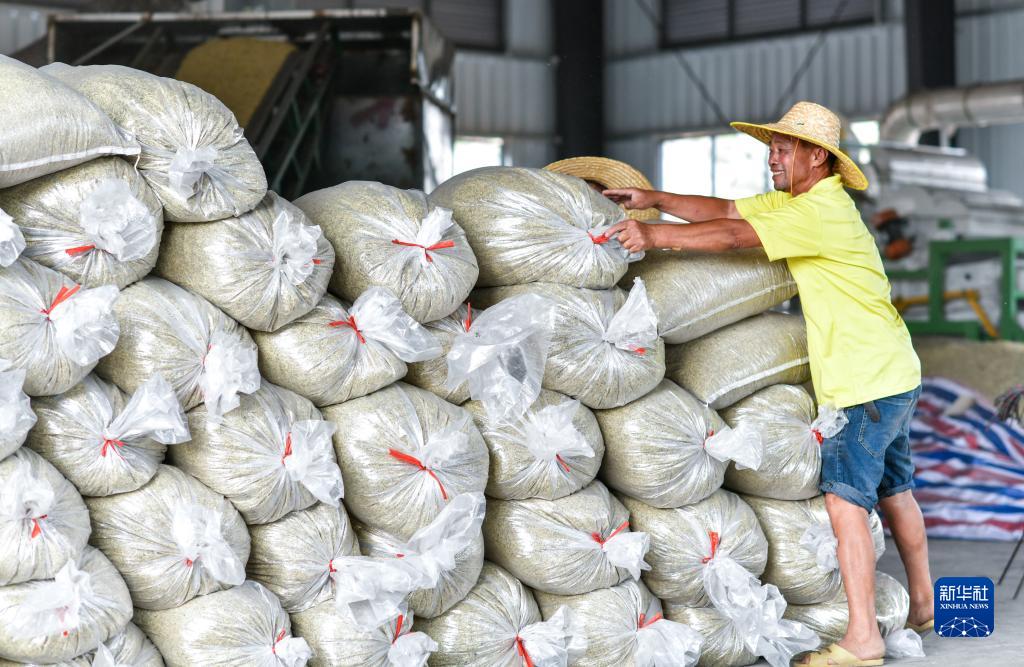 陳良東在種子加工車(chē)間搬運今年收獲的稻種(8月26日攝)。