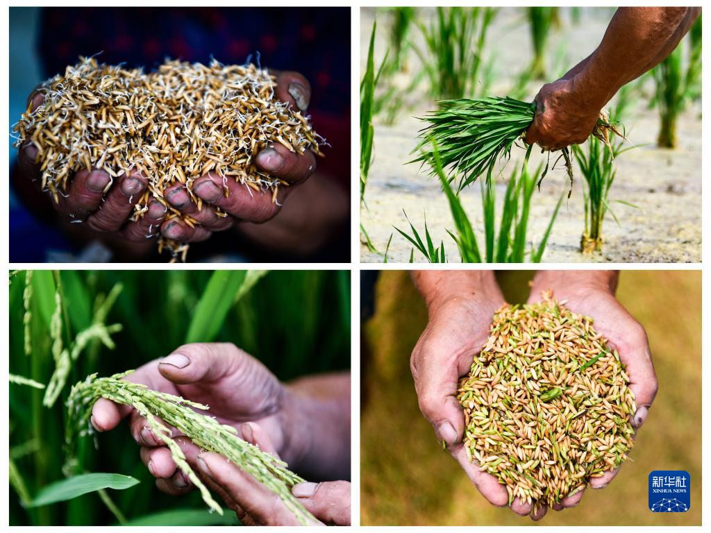 拼版照片:左上圖為陳良東在展示發(fā)芽的稻種,準備播種(4月6日攝);右上圖為陳良東在水稻制種基地里插秧(5月29日攝);左下圖為陳良東在查看水稻授粉情況(8月1日攝);右下圖為陳良東展示收獲的水稻種子(8月26日攝)。