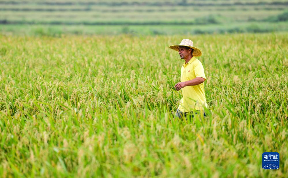 陳良東在雜交水稻制種基地查看稻種成熟情況(8月26日攝)。