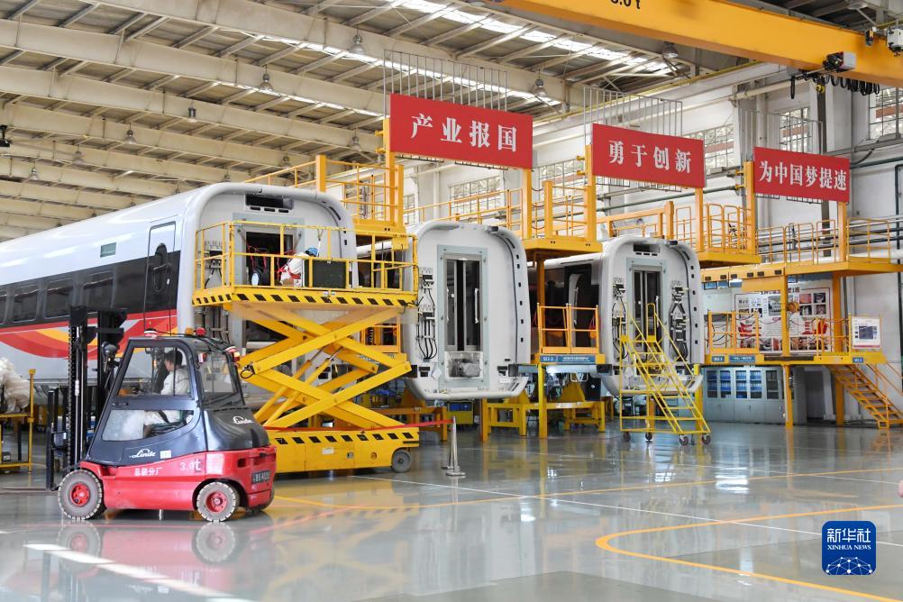 8月29日,中車(chē)青島四方總裝車(chē)間工作人員在復興號智能動(dòng)車(chē)組生產(chǎn)線(xiàn)上進(jìn)行裝配作業(yè)。