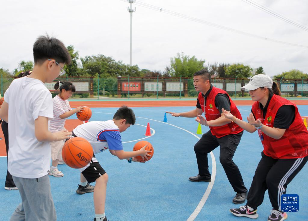 8月30日,在江蘇揚州寶應縣小天使幼兒園,志愿教練指導小朋友學(xué)習籃球。